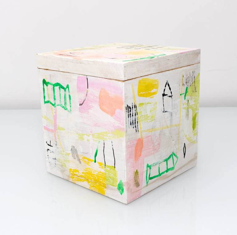 Colorful Contemporary abstract art object. One of a kind Hand painted abstract wooden box. Decorative abstract art sculpture. Media: Acrylic on wood. Protected with acrylic gloss varnish. Size: 7,8" x 7" x 7" (20 x 18 x 18 cm). Title: Quadratino 04 Support: wood Style: Contemporary Subject: Abstrac...