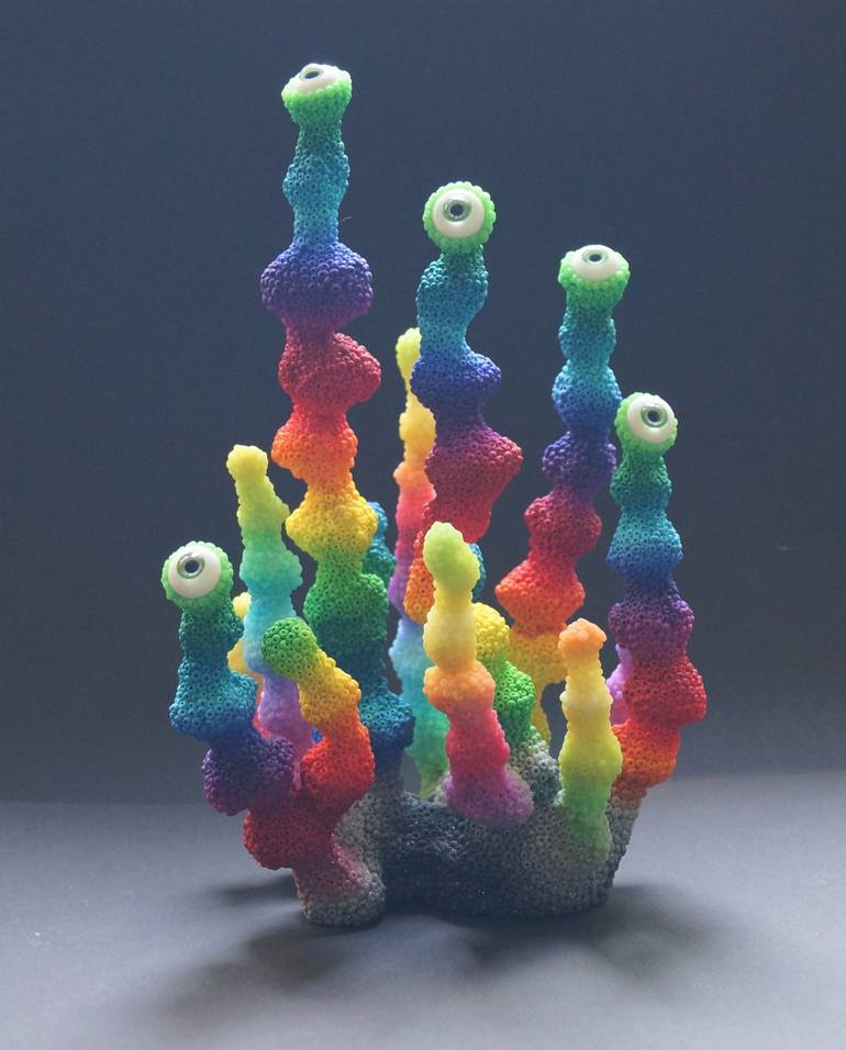 I was born and grow up in Styria and have lived in Vienna since 2000. I had my education in art School for ceramics and pottery ( 1990 - 1994 ) and completed the masterclass for ceramics and design ( 1994 - 1996 ). Polymer clay, which I processed with metal, glitter, acrylic, ink and sytetic resin,has become my material. My work is inspired by botanical rarities, animal surfaces and marine biology. The rapidly disappearing diversity and colours of nature are intended to remindus of this in a threatening and decorative way. The eyes stands for our time, in which sozial Networks, alexa, siri and co. are constantly observing everyday life. They and corporations collect save our data making us glass objects and destroying our enviroment.