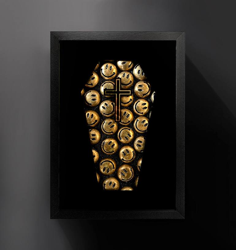 Celebrating the 50th of the acid house smiley face! Hand-pulled screen print onto glass with a 23ct gold gild. Smileys are hand rendered out of concrete, sealed, faux gold gilded, aged, varnished then sunk in a glitter render. Comes with a plaque reading “Raver to your grave, never stop..” on the r...
