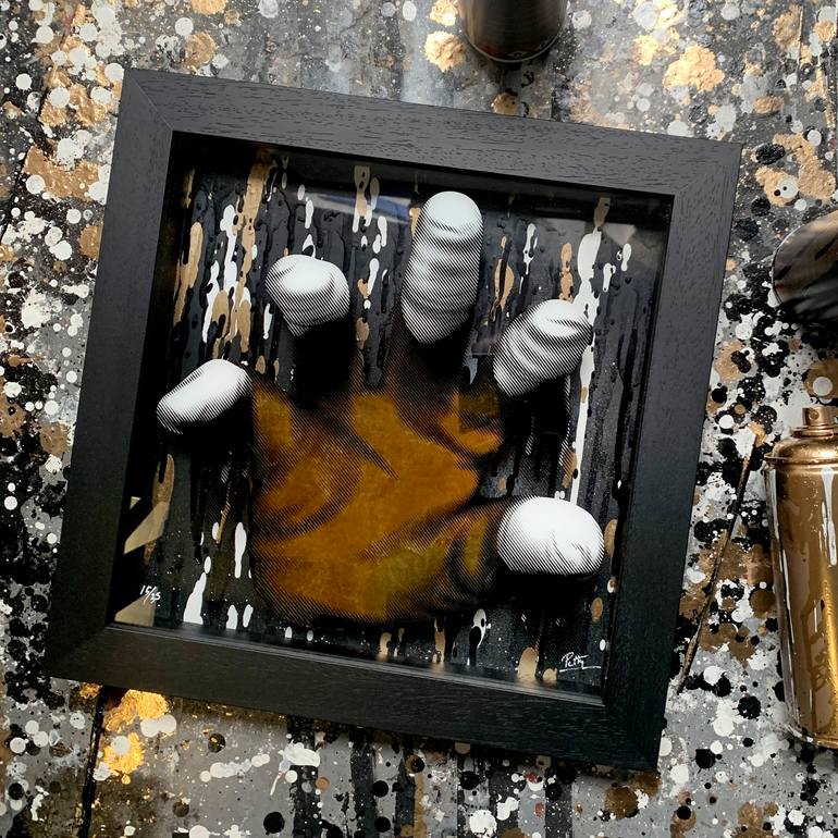 3 colour reverse hand-pulled screen print on to glass, with a 23.5ct gold water gild, raised above a spray painted background. layered up and framed. Comes signed, framed with a signed certificate of authenticity on the back. ‘Reach out and touch fate…” plaque on the right hand side of the frame. ...