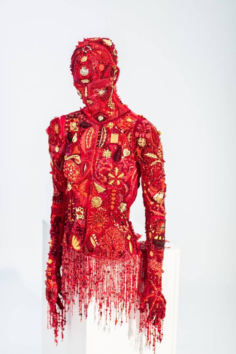 As an embroidery artist, I challenge the traditional boundaries of textile art by transforming thread and fabric into sculptural forms that embody the tension between fragility and permanence, life and death. My work draws deeply from the symbolism of ancient cultures, mummification rituals, and the metaphysical journey between the physical and spiritual worlds. I aim to elevate embroidery beyond decorative craft, crafting it into a narrative medium capable of evoking complex emotional responses and intellectual exploration. Each piece I create is a meditative journey, where every stitch becomes a passage through time, echoing rituals of preservation and transformation. By blending upcycled materials with traditional techniques such as goldwork and raised embroidery, I transcend the perception of embroidery as flat and ornamental, giving it dynamic, three-dimensional form. My art explores the beauty of impermanence, drawing inspiration from the Japanese philosophy of kintsugi, where broken elements are repaired with visible seams that honour resilience, transformation, and renewal. Through my sculptural works, I strive to bridge the gap between tradition and contemporary expression, intertwining historical references with modern narratives of sustainability and rebirth. Each imperfection is intentional, serving as a testament to the human condition, where embroidery becomes a living story—one that speaks of memory, mortality, and our eternal yearning to transcend the material and embrace the spiritual.