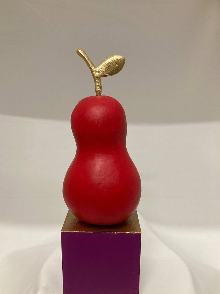 Continuing my interest in shape and colour this is an interpretation of the red, a rich, warm, strong colour. To highlight its quality it I have used a compatible colour and gilding. It also includes my interest in mixed media: the pear is fibre and clay, painted in oil colour and the base is of...