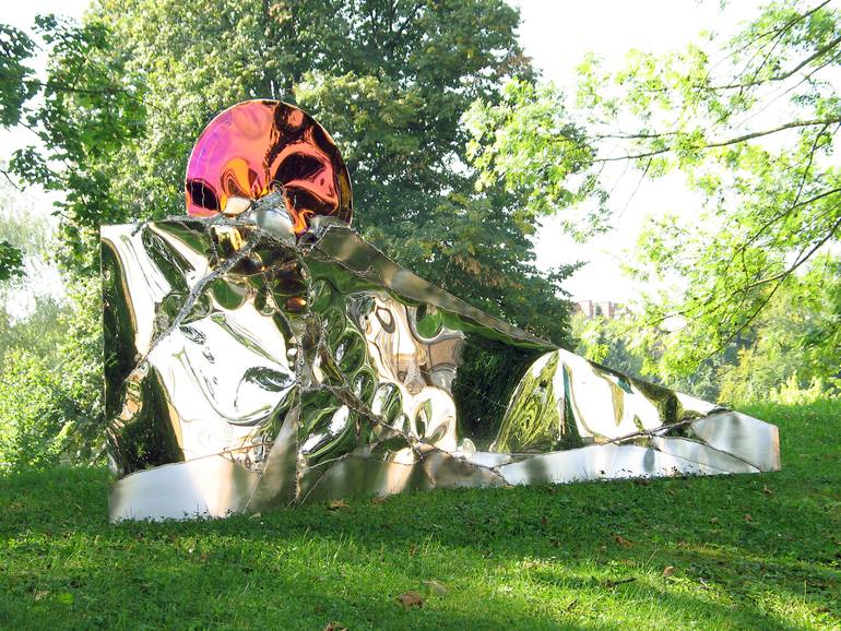 Welded sculpture made of mirror polished stainless steel and red stainless steel