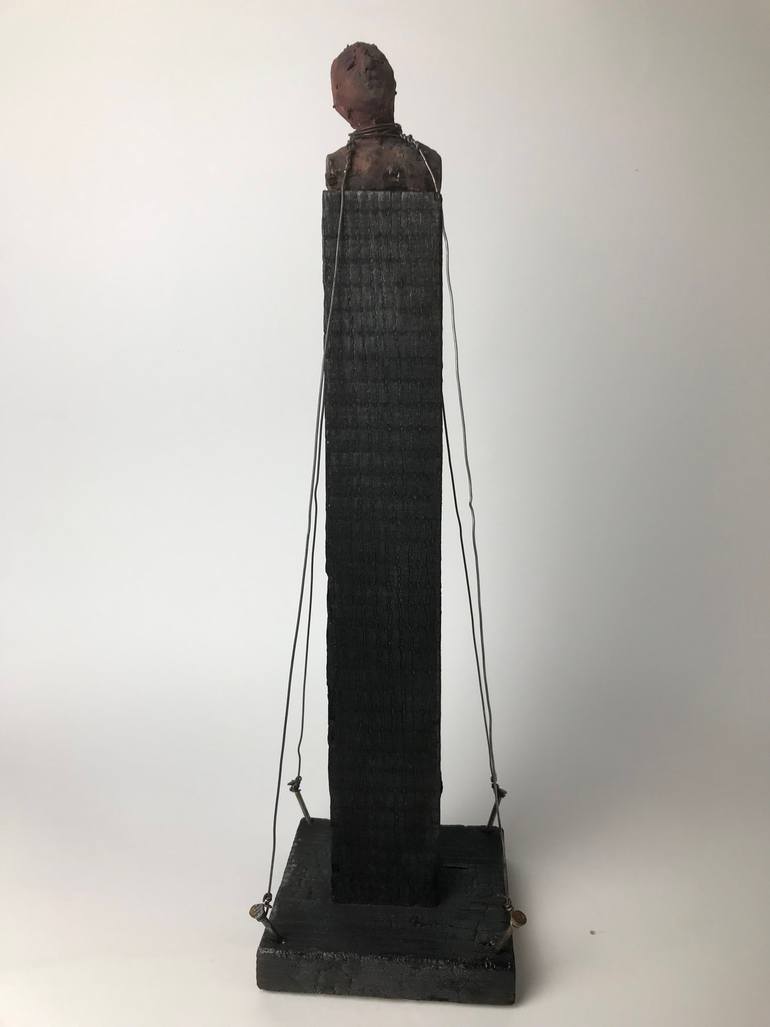 Legato mi ergo fermo e resisto al vento della vita. Il tempo disegna le rughe, strade dove sono già passato è li che ho visto l’amore, i tramonti, il dolore e la felicità. L'opera è realizzata in legno carbonizzato, terracotta trattata con ossidi, filo di ferro e chiodi.