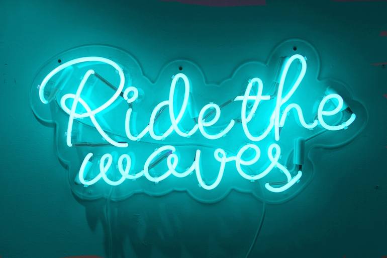 This neon piece is hand blown glass in Turquoise. It is mounted on contoured, clear plexiglas with pre drilled holes for hanging, and comes ready to hang. This piece is offered in the following colors: White, ruby red, orange, coral pink, violet, turquoise, emerald green, promo blue and light blue. ...
