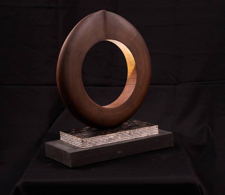 This fine art is part of Rade's wood sculpture collection. It is of rich walnut, and comes mounted on a stone stand with a wooden base.