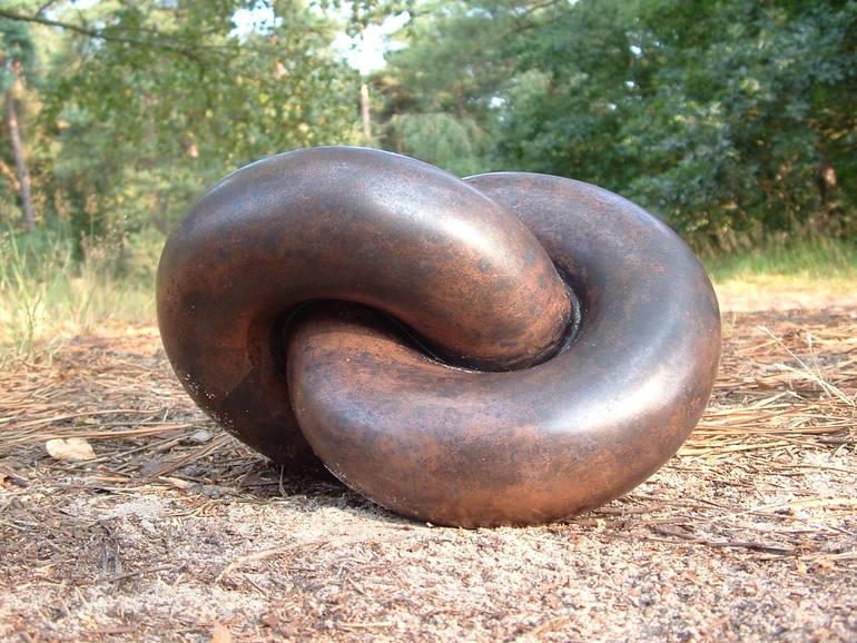 The artwork is a tight connection of two bronze rings with no space in between. No metal pipe with this diameter could be bend in such a way, unless melted and poured into a mold. The principle of duality and unity is highly expressed: the two become one. In spite of its tightness the piece can stil...