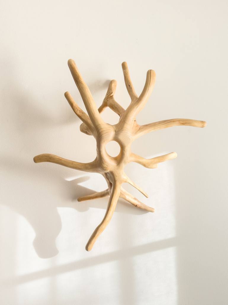 “This work, created entirely from the root of a tree, expresses a profound dialogue between nature and sculptural form. The artist captures the intrinsic essence of the root, respecting its natural shape yet revealing a conceptual reworking that transforms the organic element into an almost mytholog...