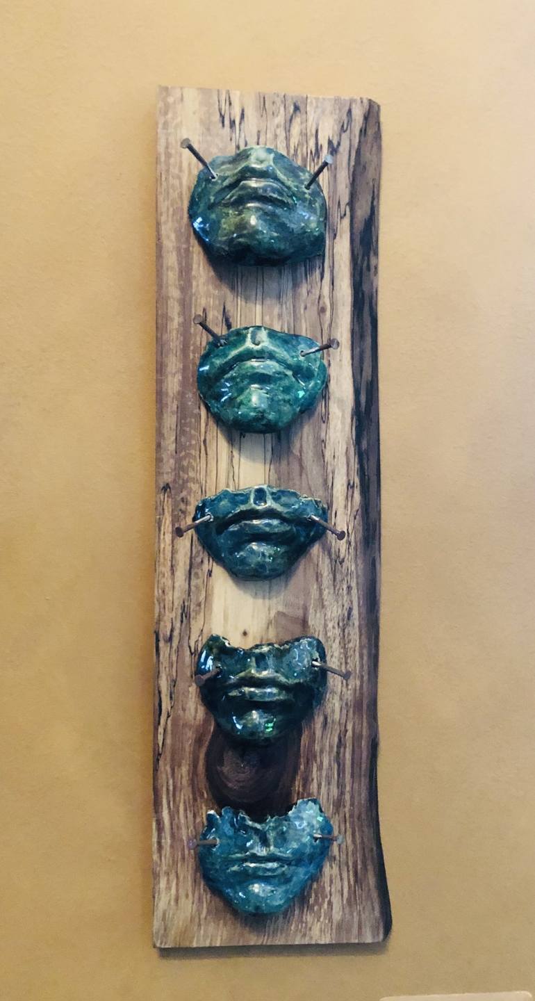Speak your truth, speak your mind, stand up for what you believe in. Crucified. Dichotomy of what we are told and what is actual. The struggle is real, Hand-built ceramic sculpture with custom glazes accented with India ink. Mounted with steel nails on live edge walnut wood.