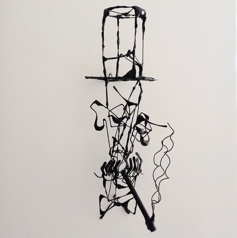 Wall sculpture made of 18-gauge galvanized wire, moldable paste and black acrylic paint, showing the figure of an elegantly dressed english lord, with a top hat and bow tie, smoking a cigar waiting to happen whatever it may happens. The style is cubist/abstract minimalist.