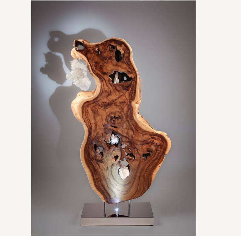 Materials: Quartz Crystal, Acacia Wood, High-Polish Stainless Steel Base, LED Light from The Light Within Collection