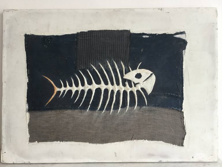 Fish skeleton sculpted on sea bottom made of ancient japanese fishermen sashiko indigo trousers. This painting sculpture in one of the series inspired by torn pieces of ancient japanese indigo clothes which I had the chance to collect during my activity as a fashion and fabrics designer. To me, ind...