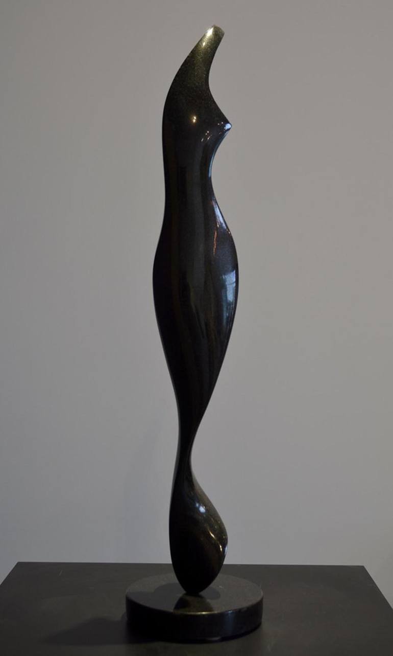 Michael Binkley carved this abstract female torso from absolute black granite from India. His inspiration was from a sketch he did mid September, 2022 (see his Insta feed). Binkley polished the surfaces of the sculpture to a high gleam and mounted it on a circular base of the same material. The scu...