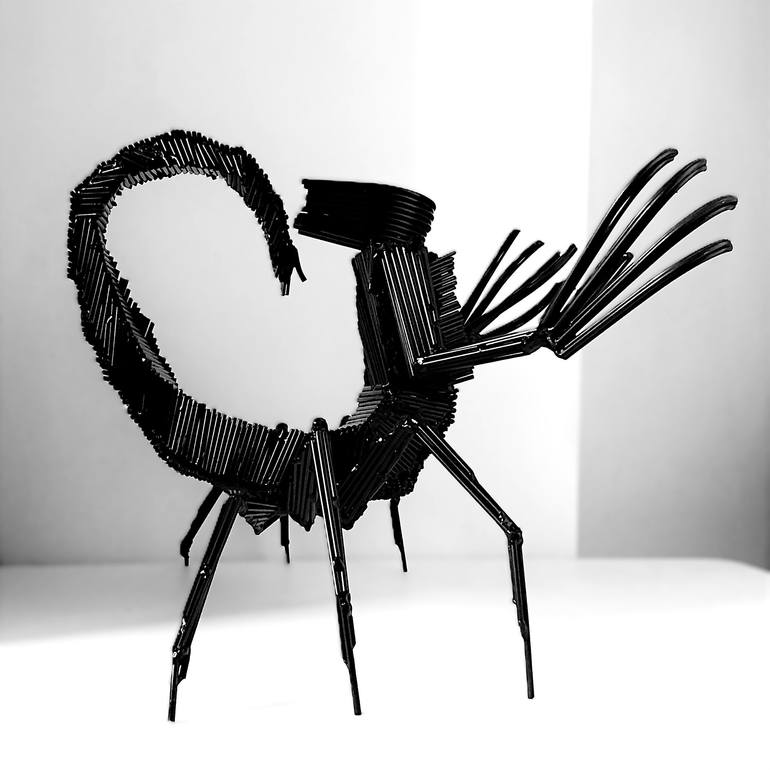Scorpio - The Alien. Sculpture by Albert Dura. This special sculpture takes you into the realm of reflection on the cosmos and its mysteries. This metal sculpture is very unique and hand formed. Colour: steel, black, lacquered. The sculpture is sold with a certificate of authenticity - signed a...