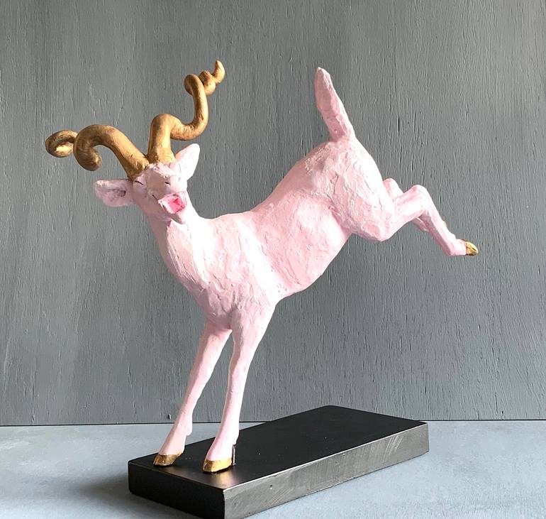Tosca van Oorschot is fascinated by nature. She creates botanic paintings incorporating female faces. The faces are mostly in flower form. She uses lace to make the faces fit into the botanic whole. The viewer can give his own interpretation to the dreamy scene. Her work is sold wordwide and presently exhibites in gallery Sous-Terre in Lithoijen Netherlands. The other expression of Tosca’s artistic zeal is the versatility of the realm of animals and wildlife. Animals don’t laugh, is the common opinion, but people can laugh about animals. We do not mean the funny clips on internet, but the influence of the artists hand which provides an animal with a comical effect. That is the specialty of Tosca van Oorschot. Her sculptures concern animals with human traits, eliciting a smile from the spectator. “I am motivated by the urge to make people happy,” she says. “I love animals and due to my light-legged approach I give them a comical appearance.” Examples are a laughing rabbit, animals covered in fashion from the renaissance, a hairy cow with a cap or a coat and a hippopotamus with a collar and a hat. Thus she accommodates animals with a joyful character and links them to a human touch. The sculptures are fabricated in neolith, a ceramic material (resin filled with marble powder) which makes the pricing of the works attractive for the admirer or buyer. She produces a mold and subsequently let the work cast in the form. When it concerns an assignment the works can also be manufactured in bronze.