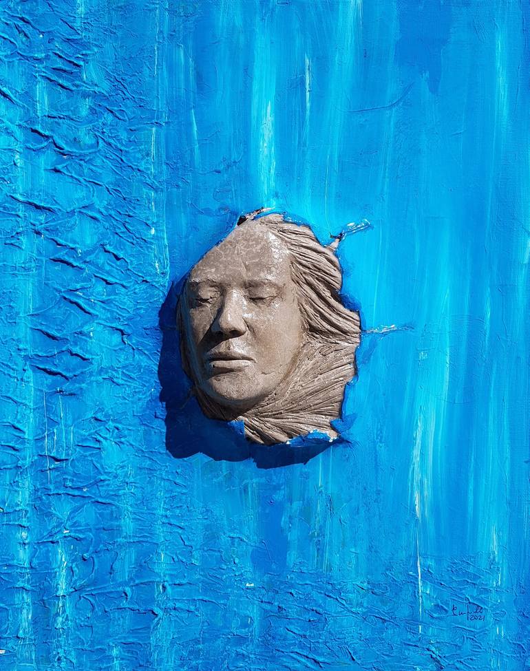 La scultura ritrae un volto femminile. E' stato scolpito in argilla e riprodotto in cemento. La scultura è stata inserita in una tela colorata con colori acrilici. La scultura in cemento è stata trattata con vernice trasparente. Non necessita di cornice, perché anche i lati della tela sono stati col...