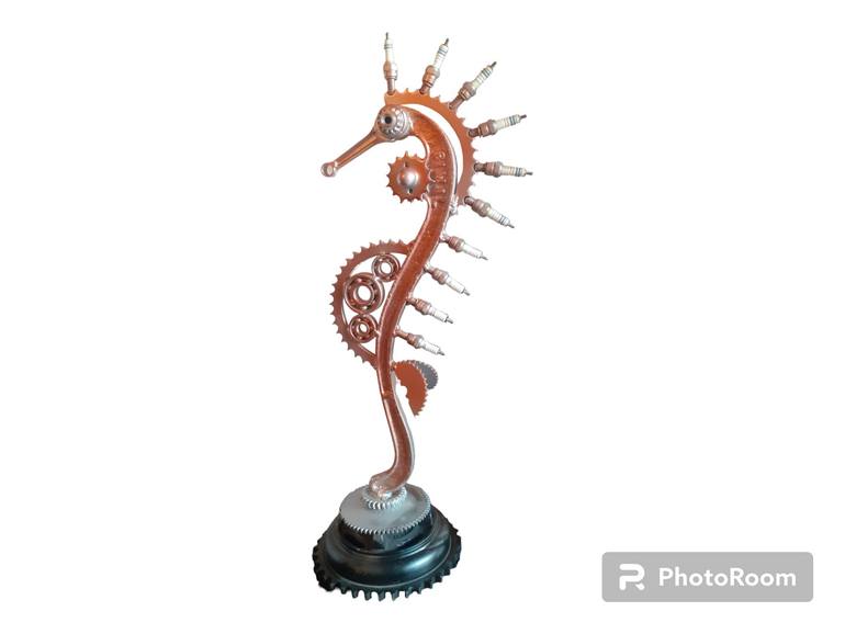 This seahorse is made from metal scrap and automobile scrap, then it was mixed shading of silver and copper color, which brought out its beauty. This table top sculpture will look very beautiful in your living room, when there is a warm white light in the evening, it looks very beautiful.