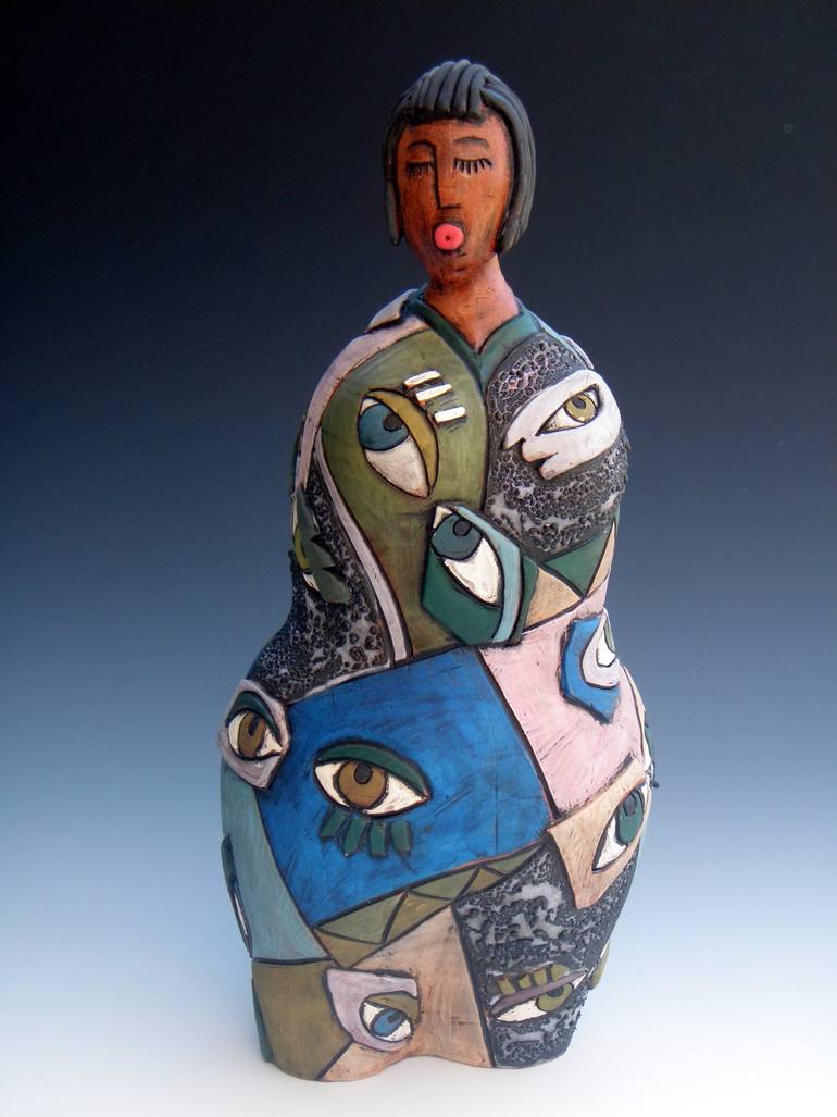 Earthenware Sculpture, handbuilt, color stains, carved, fired twice, only piece, exclusive