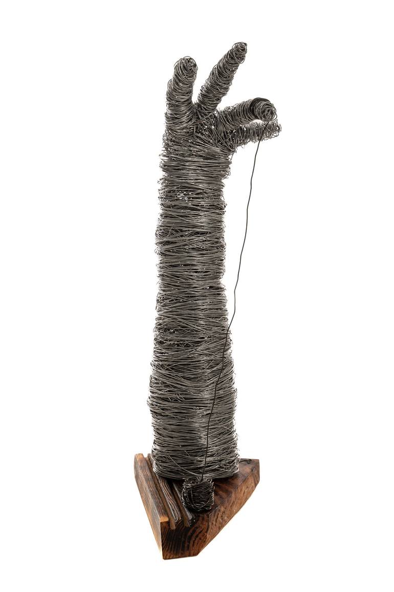 Self-amputation No. 1, 2022 – Catalogue No. 1522 56 x 18 x 29 cm, 3536 g Zinc coated steel wire, annealed steel wire, steel bar, nails. Handmade wooden base with a burning technique inspired by the traditional Japanese yakisugi. Pure linseed oil finish. Branding iron signature.