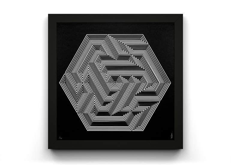 Born in 1978 to an English father and Singaporean mother, Myoshka’s life and work has been significantly influenced by a mix of Eastern and Western cultures. His artworks are created with meticulous and painstaking detail and utilise skills from a number of visual disciplines, combining traditional techniques with contemporary manufacturing processes. Myoshka’s oeuvre is driven by balance and contrast – the artist re-appropriates symbols and sacred geometric shapes from religious contexts such Buddhism and Islam. For each element of Myoshka’s work, one finds its opposite closely integrated, allowing the interaction of negative with positive, the dialogue between light and dark and the tension between disruption and harmony. Within each artwork a powerful optical effect is created as the artist appropriates and masters a core symbol or element. He concedes that creating these intricate, highly detailed patterns and forms is a meditative process.