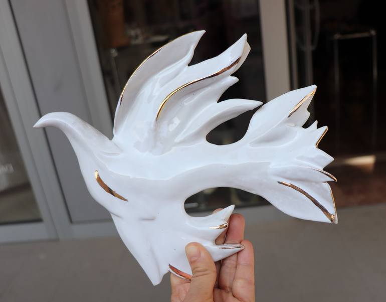 Haven bird .Hanging on the wall sculpture, made by hand with white clay , glazed with white shine glaze and decorated with gold luster. You can use it for wedding decoration or bridal gift . Bird is painted with 12% gold and then fixed in high temperature, so it is safe to use.