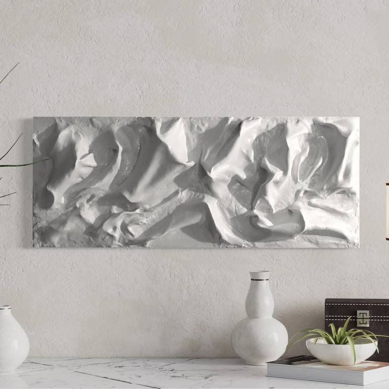 This piece of abstract art is made by air dry clay on canvas it is white in color, and the finish is smooth.
