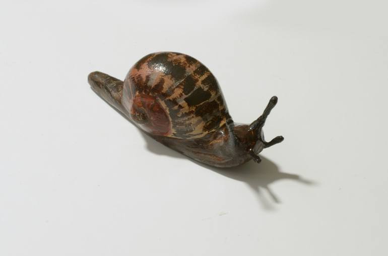Unique original hand-made sculpture of a snail. Part of the Natural Enemies playset. Life size. Das air-dry porcelain, Liquitex acrylic paint, steel wire and PVA varnish. Dimensions 8 x 2.5 x 3 centimetres.