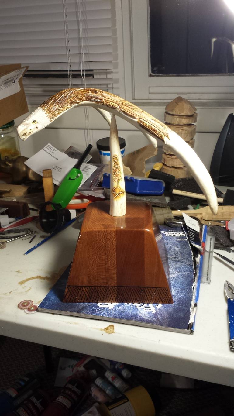 "Soaring Eagle" eagle carved from deer antler, moose antler and solid maple wood base and stained with a natural walnut reduction stain. Carving is balanced, will spin at the slightest breeze or touch, won't fall off or break unless excessive force is used