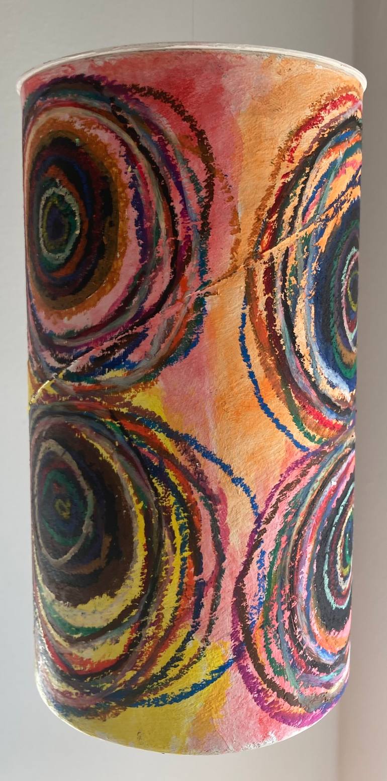 Cy Twombly, Alexander Calder, Howard Hodgkin,are artists that inspired me . I want the viewer to see the energy bursts and feel the power. I chose a cardboard container with a plastic lid because of the lightweight qualities and mobility. Hanging hardware is included.