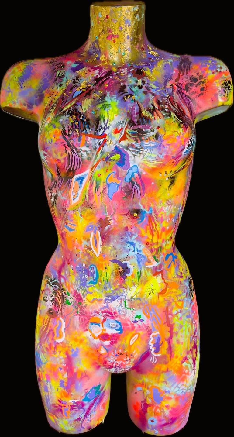 Solina" incarne l’énergie vitale et la connexion entre le corps et la nature. Ce buste sculptural, baigné de couleurs vibrantes et lumineuses, évoque un être en pleine métamorphose, un corps traversé par la lumière et la vie. Sur le dos, des lianes vertes semblent s’élever le long de la colonne ve...