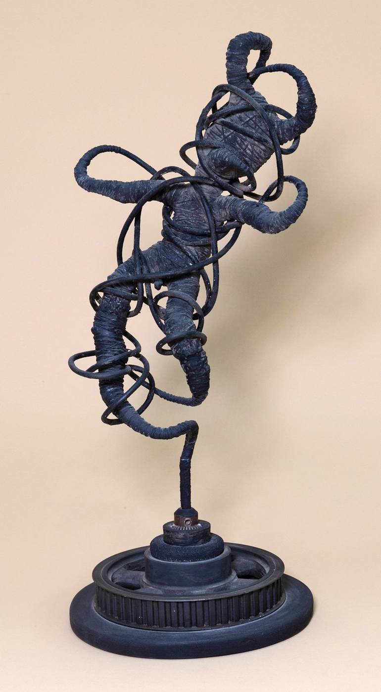 Figure floating as if in weightlessness in a gangue in the middle of a skein of cables which connect it to its base, a heavy metal plinth. The whole thing is painted black. This sculpture symbolizes the modern individual who is increasingly connected to various networks which he will soon no longer ...