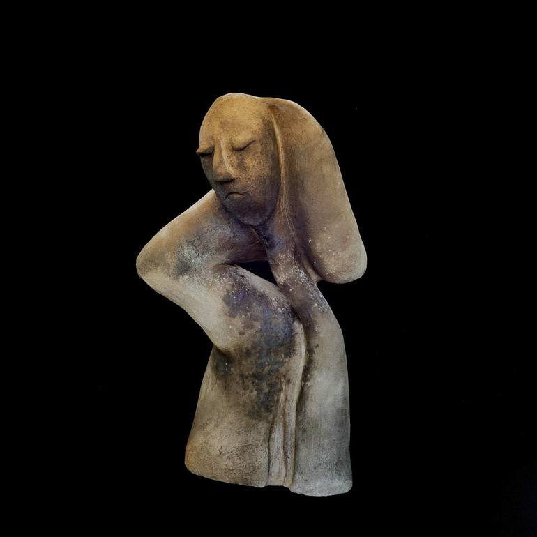 This piece was constructed as a macquette for an installation piece about religion and science. It takes the form of a face and body suffering sorrow. It is fired in a sawdust kiln, which gives random grey smokey effects.