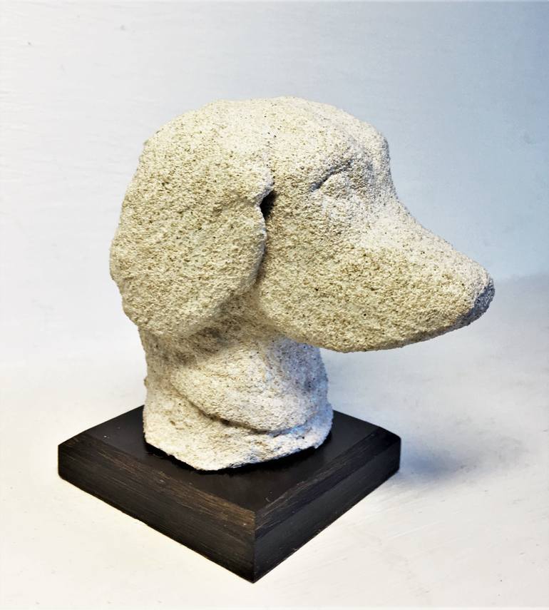 A mixed media sculpture with a limestone finish of a head study of a spaniel mounted on a chamfered edged bakerlite base. I'm a lifelong dog lover and never need an excuse to paint or sculpt them as they always inspire me with their individual characteristics.