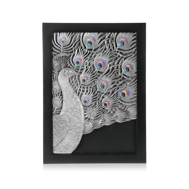 Size: H 14.97 inches x 11.03 inches x 1.19 inches With tail coverts raised and unfurled in full display, the peacock shows off the extent of its dazzling plumage. This plaque, sized for the desk or shelf, makes a deliberate point to emphasise its gorgeous subject. Sculpted pewter brings rich textu...