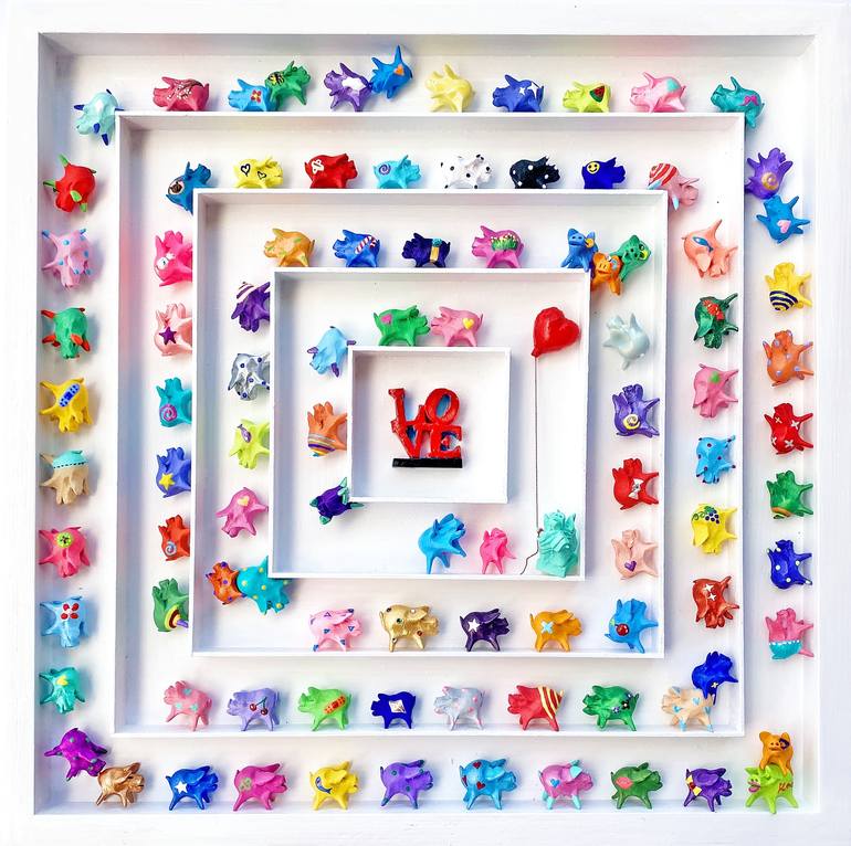 Acrylic on ceramic on wood panel The little pig figurines are symbolic of all people. Each pig figurine measures 0.5" x 1" x 0.5". All of the pigs are made out of ceramic, while some of them are painted with acrylic. Each pig is handmade, a mold was not used because it is a meditative practice of ...