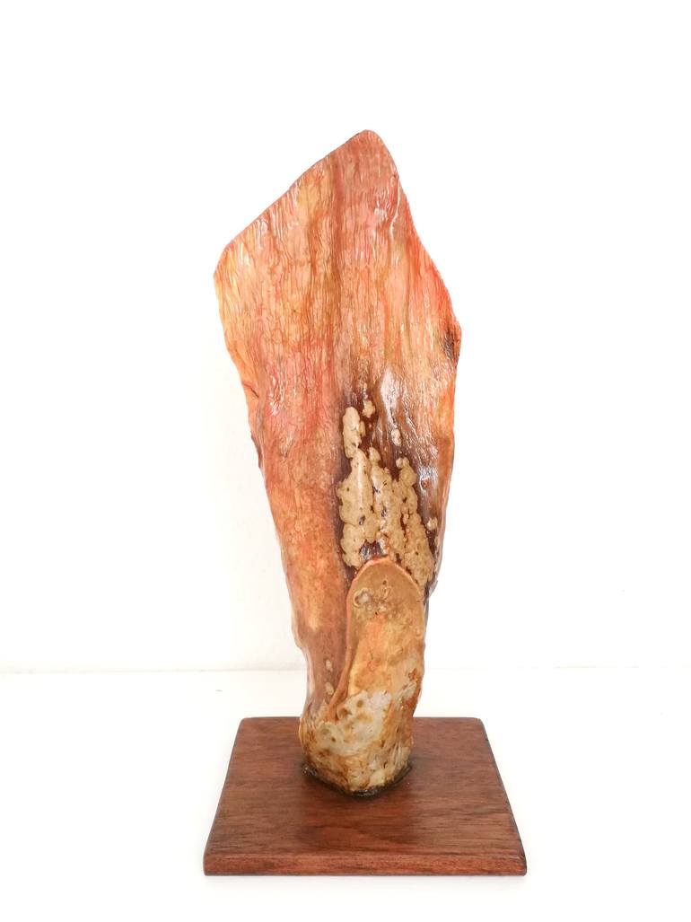 The work was inspired by the particular shape of the wood collected in nature from an Agave's wood, the american plant. The tapered and linear shape inspired me and so I decided to color the surface with a orange acrylic color and behind I left the natural color of the wood. The layer of the epoxy r...