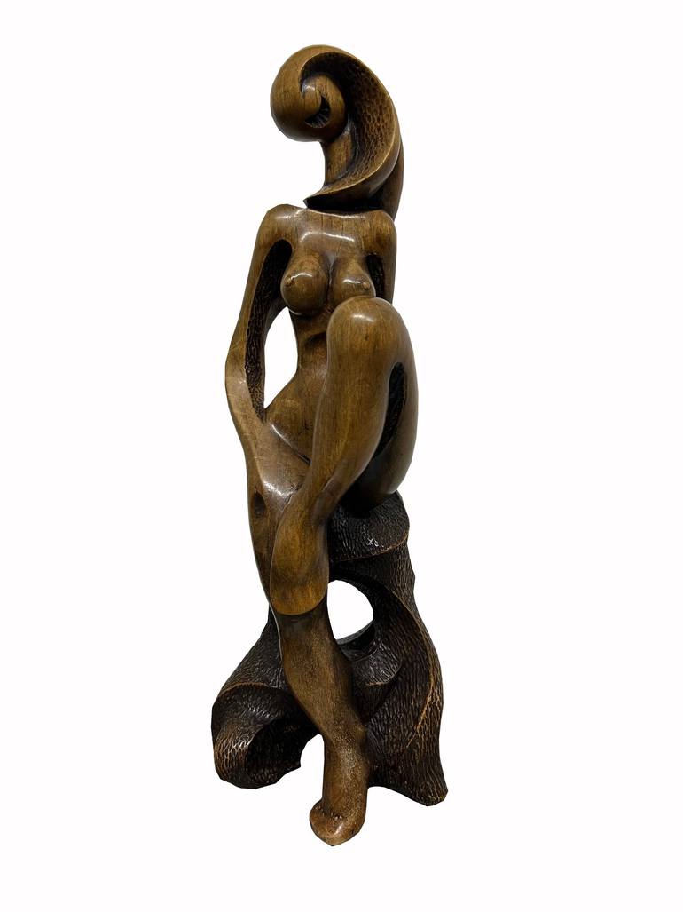 This sculpture depicts a beautiful and brief moment when a woman comes out of the water and sits on a rock to admire her reflection. Symbolism and abstraction are mixed together, celebrating beauty and life. Through cut, solid wood, acacia.