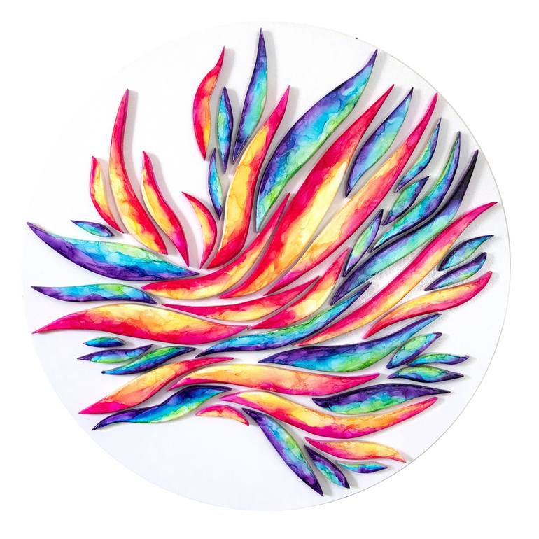 A pop of color, bringing life to any space. A sunburst celebration. An abstract wall sculpture painting hybrid. I cut and sand each piece of wood before prepping with a white latex base topped with spray paint. After the cutting and prepping process, I paint each piece using alcohol ink, rubbing al...