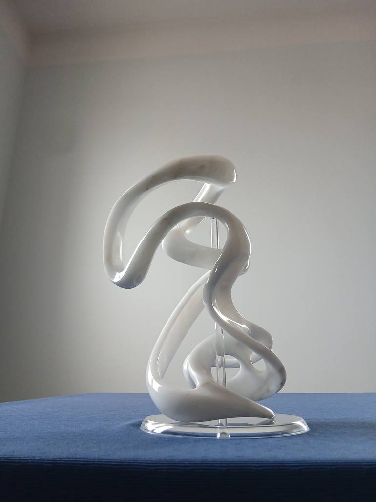 A fase of thinning this carrara statuario and polishing the surface with so much care. The artwork can stands safe and stably, in two upside-down positions, on the transparent plexiglass base with the stick in the center. The whole surface is uniformly smooth and polished.
