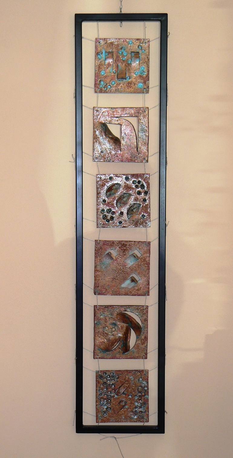 “Sunset” is a vertical or horizontal mosaic, depending on how it is hung, of six ceramic tiles, each cm. 20x20 suspended from the black iron frame with natural rope. It belongs to the A..mareggiate collection described below, and has the characteristic of the carvings and reliefs I make in the tiles...
