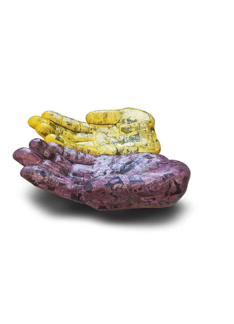 A three-dimensional artwork that depicts two palms praying in the Islamic style. The work carries the symbolism of good and evil, light and darkness, love and hate, male and female. This is embodied in the two colors represented in each palm. Yellow represents the color of sun, day, and goodness, wh...