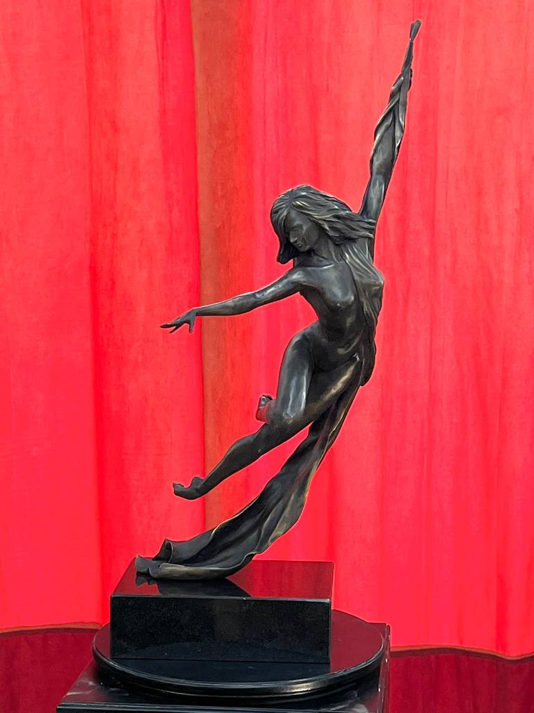 PLEASE NOTE THAT THIS PIECE IS ON ORDER ONLY. YOUR PIECE WILL TAKE 6 WEEKS TO CAST IN BRONZE BEFORE IT CAN BE SHIPPED TO YOU. This mesmerising sculpture captures a moment of pure elegance and poise. Willem Botha masterfully depicts a female dancer frozen in mid-air, her form exuding a sense of weigh...