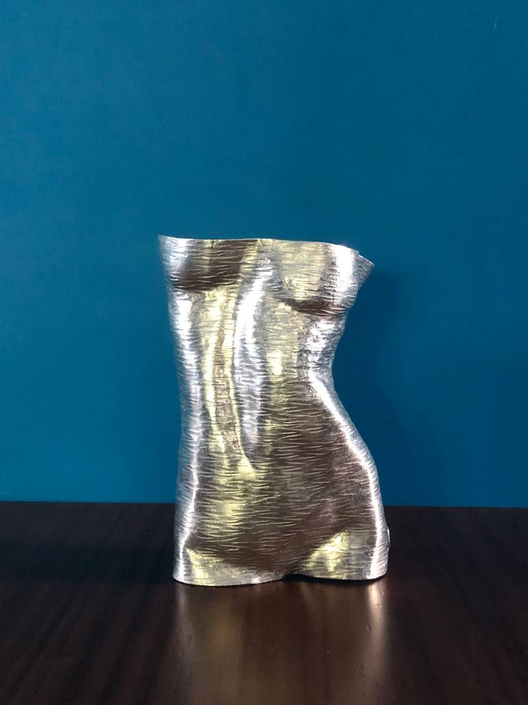 The sculpture is formed from a 13x13 square tin sheet, mostly using hands with the help of wooden tools, the signature chop is made out of paper clay.