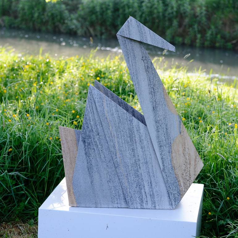 Swan in a sculpture from my origami series. I work with paper models that I can reinterpretate in stone seeking the aspect of folding paper and the durability of stone. This particular piece was sold and flu to Bermudas but other swans from the same flock are available by commission.