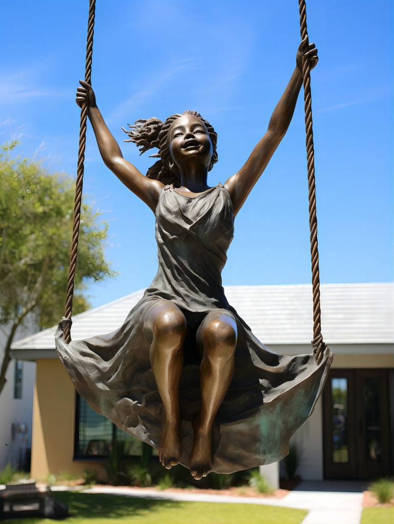 “Swing Dreams”created by Isabella Marie Rogers, captures the innocence and joy of a young girl finding freedom and exhilaration in a simple swing. The girl, dressed in a flowered dress, her arms raised high above her head, embodies the pure bliss of childhood. The sculpture honors the transformativ...