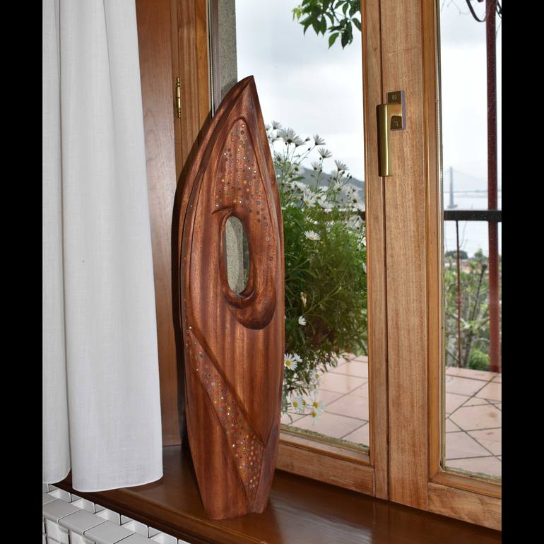 Symphony V, direct carving in Sapelly wood, African wood. With colored inlays, the idea was to generate the movement of the planes like the melody of the sea. Where forms dance in constant harmony. Hand polished. I hope that the viewer enjoys the work as much as I do when seeing it and imagining it ...