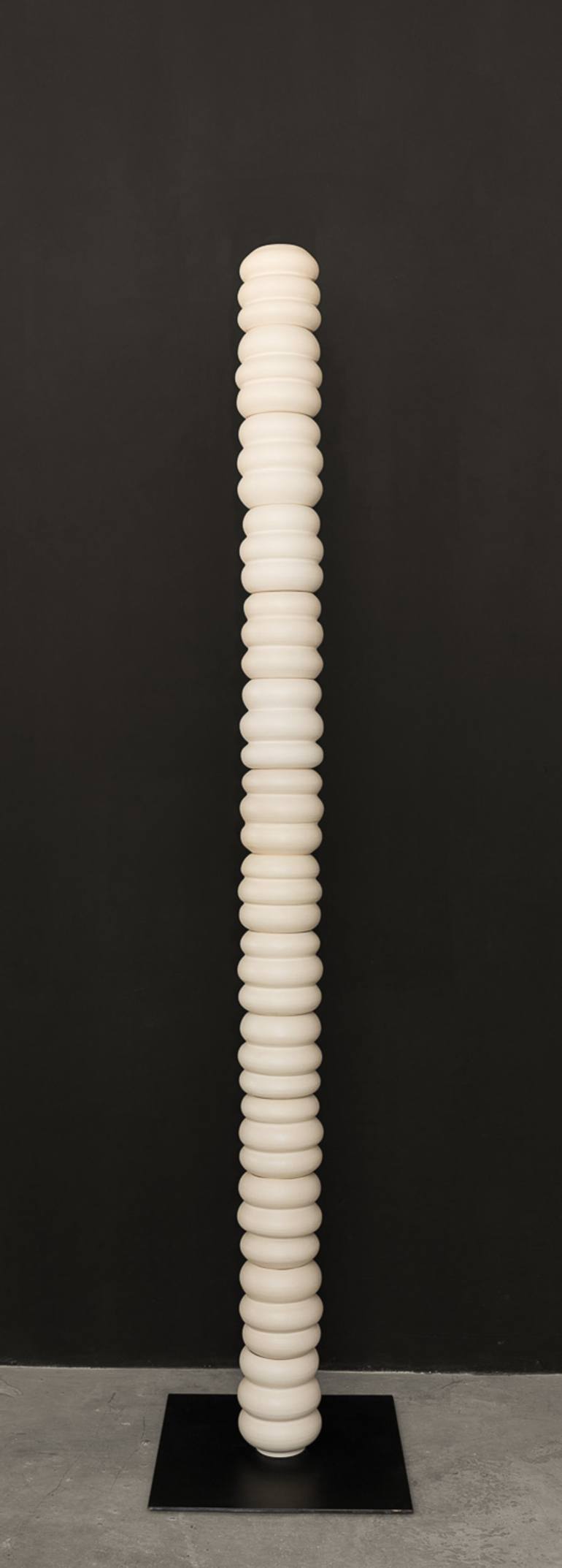 Totems with compositions based on piled up ceramic pieces from the area of utility ceramics. ​ Bowls, vases and plates that, when put out of context, turn into abstract geometric figures. - Once formed on the potter’s wheel, they are deformed and drilled in order to line them up on an iron tube, c...