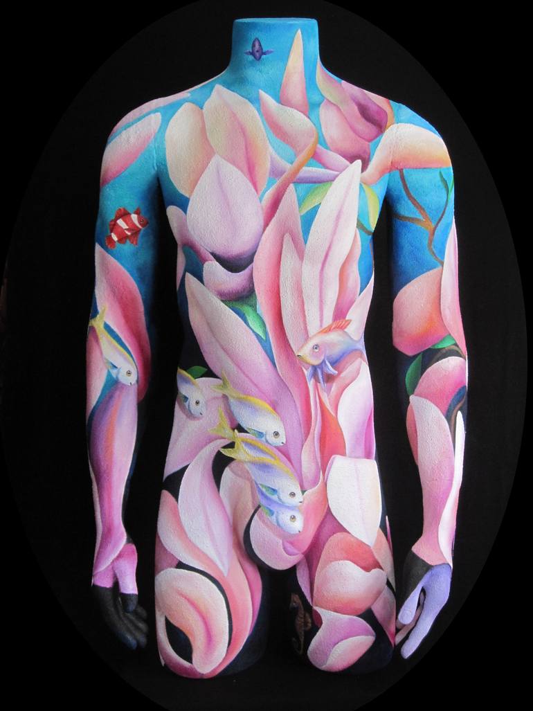 Oil and sand on fiberglass. Surreal representation of tropical fishes swimming trough the branches of blooming magnolia tree