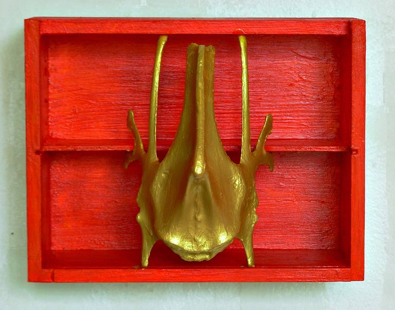 The one-of-a-kind box assemblage, also a work in my “VIRAL SERIES”, is wired in the back to hank of a wall. The media include: pine wood, gesso, glues, turkey bone, acrylic paint, and metal. During the Black Plague of the middle ages, the people of Venice wore masks with long bird-like noses in an ...