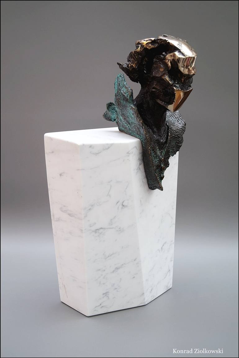 TYRMED bust made of bronze and white Greek marble. The bust presents interpretations of the human head. Through the openwork and dynamic shapes I wanted to find a energetic and ethereal character.